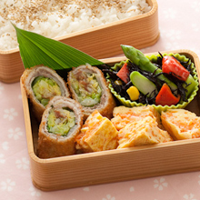 キャベツと梅干しを巻いた巻きとんカツに、野菜たっぷりのおかずを詰めて、お花見に出かけましょう。