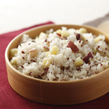 「豚ヒレとさつまいもの黒酢あん」「さつまいものおこわ(右写真)」「レモン風味のスイートポテト」など、さつまいもをたっぷり味わう6つのレシピをご紹介します。