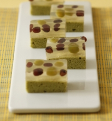 「浮島」は白あんを混ぜこんだ、和風の蒸しケーキ。同じ型で寒天菓子を作り、浮島と2層に合わせました。ほんのり梅酒が香る寒天は、甘納豆入りで、見た目もすてきです。