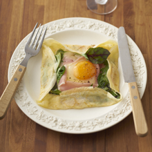 ガレットは、フランス、ブルターニュ地方の郷土料理。通常はそば粉を使いますが、入手しやすい薄力粉と強力粉で作ります。クレープに似ているものの、甘くないので、食事にも。