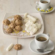 卵白を使った、タイプの違う2つのお菓子を紹介します。ムラング(メレンゲ)シトロンは、卵白を泡立てて、空気をたっぷり含ませたメレンゲをじっくりと焼きます。一方、ナッツのマカロンは卵白を泡立てずに作るもの。どちらも軽い食感を楽しんで。