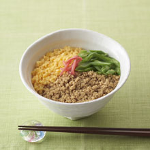 主な食材は3種類だけの素朴なごはんながら、根強い人気の三色丼。お弁当の大定番ともいえます。甘からいとりそぼろ、甘いいり卵、さっぱりとした緑の野菜のバランスが絶妙です。ひとつひとつをていねいに仕上げましょう。