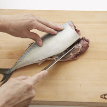 今回は、「さば」。身幅のある大きな魚の三枚おろしを覚えましょう。腹と背に切りこみを入れるのがコツ。