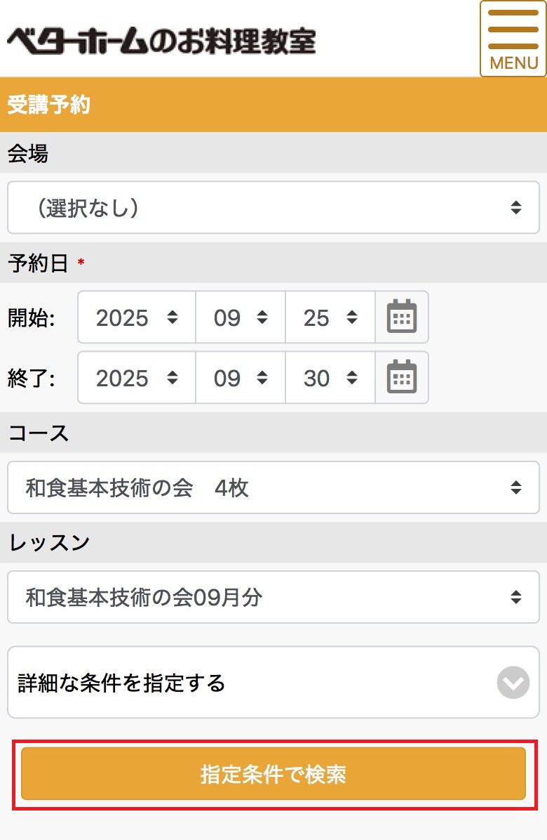 4.「予約日」と、そのほか任意の条件を設定して「指定条件で検索」をタップします。