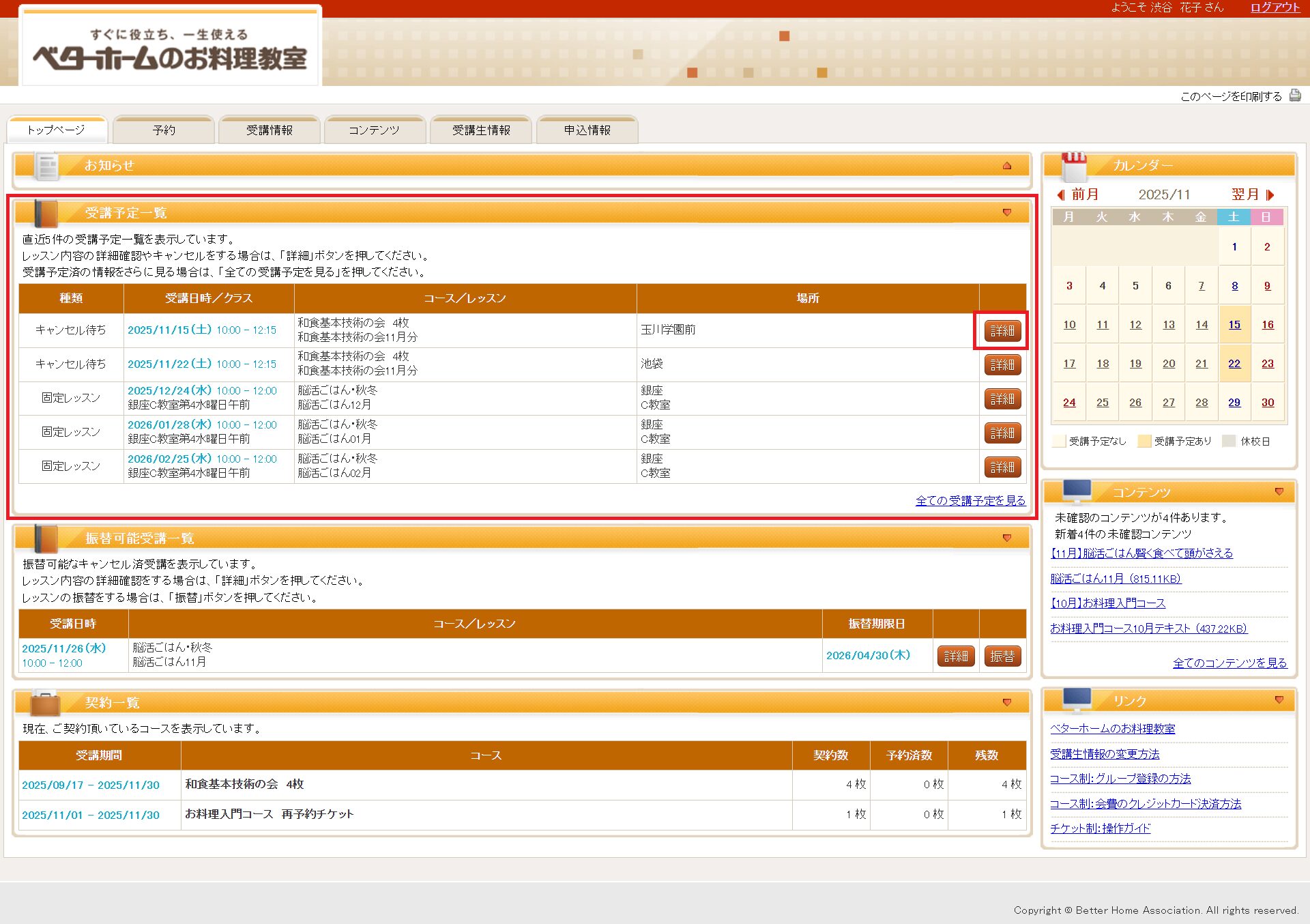 3.トップページの「受講予定一覧」から、空席速報(キャンセル待ちメール)が届いたクラスの右端にある「詳細」ボタンをクリックします。