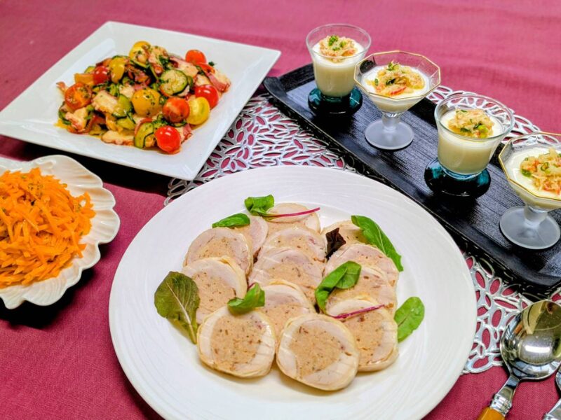 「ガランティーヌ」とは、ひき肉などの詰めものを鶏もも肉で巻いて、蒸したり焼いたりする料理。断面が美しく、おもてなしにぴったりの一品です。