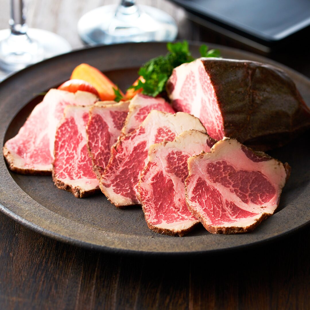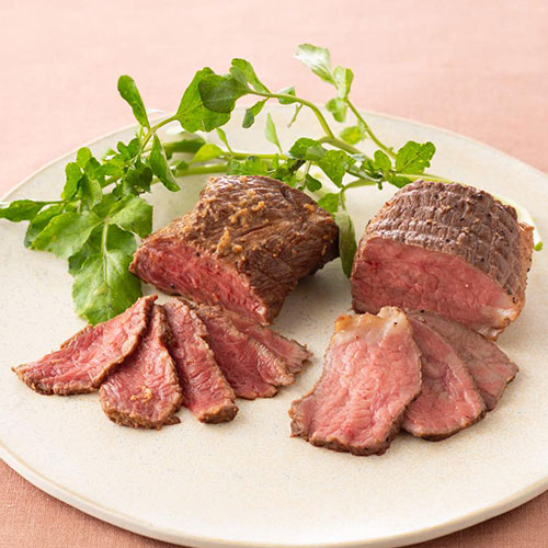 ハーブ入りの飼料で育った牛のもも肉を使用。プレーン(塩・こしょう味)と和風みそ味の2種セットで、冬の定番人気商品です。
