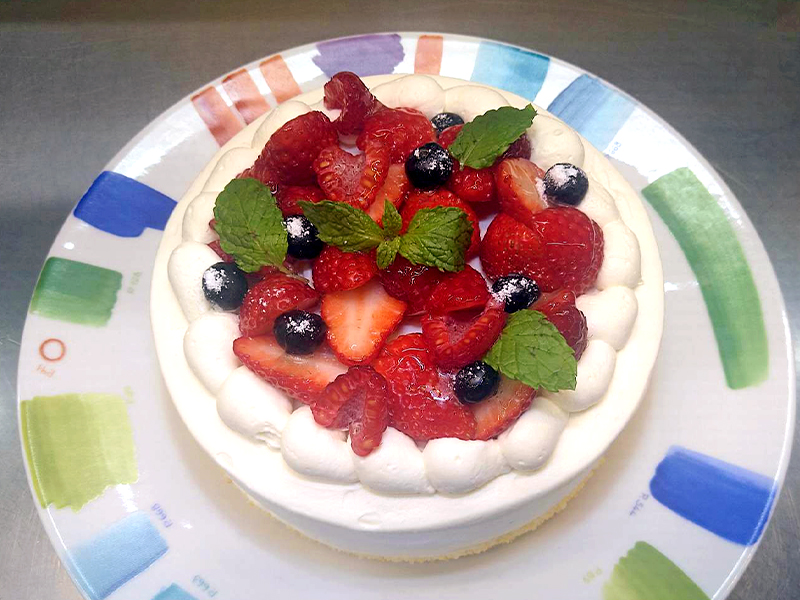 1人1台・直径15cmのホールケーキを生地からていねいに作り、生クリームを塗って仕上げます。