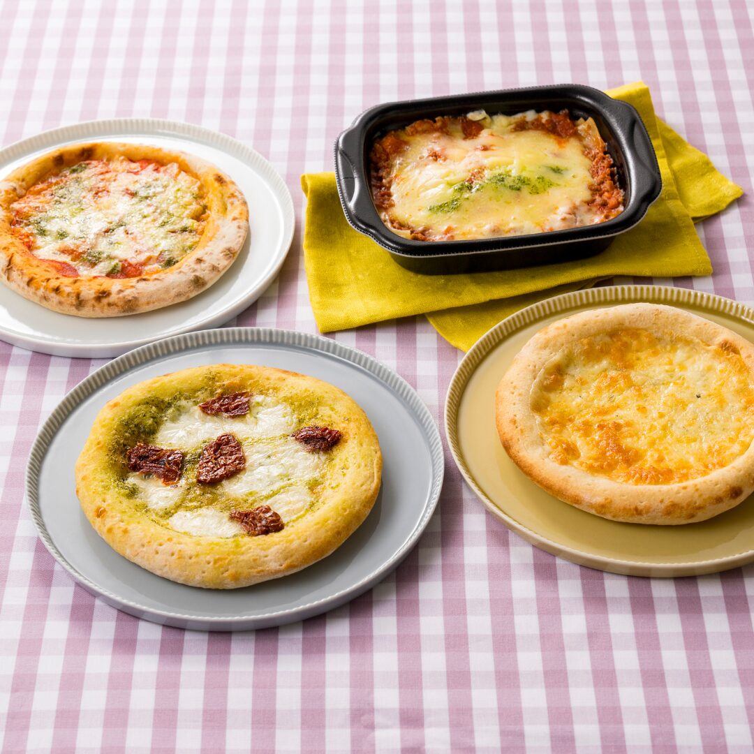ラザニアボロネーゼ、マルゲリータ、クワトロフォルマッジ、ジェノベーゼの4種セット。ラザニアは電子レンジで、ピッツァはオーブントースターで温めるだけ。