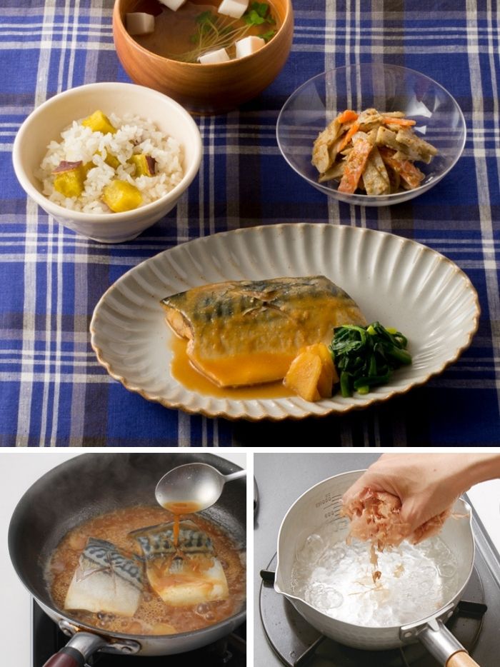 脂ののったサバを、コクのあるみそ味で、こっくりと煮あげます。ごぼうのサラダとすまし汁、さつまいもの炊き込みごはんを合わせ、冬においしい根菜の和の献立に。