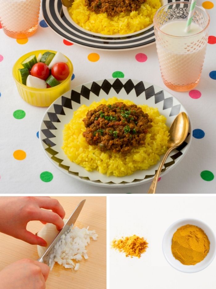 おなじみのカレーも、ドライカレーなら、趣きが変わってちょっと新鮮。煮込まないので、忙しい時にすぐに作れるのもうれしいところです。ピクルスとラッシーは、カレーと好相性。おいしさを引き立てます。