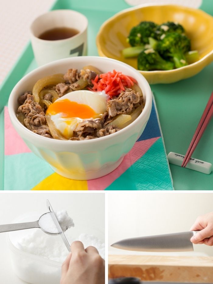 外食で人気の牛丼が、自分でおいしく、かんたんに作れます。野菜の小鉢を添えて、栄養バランスよく。